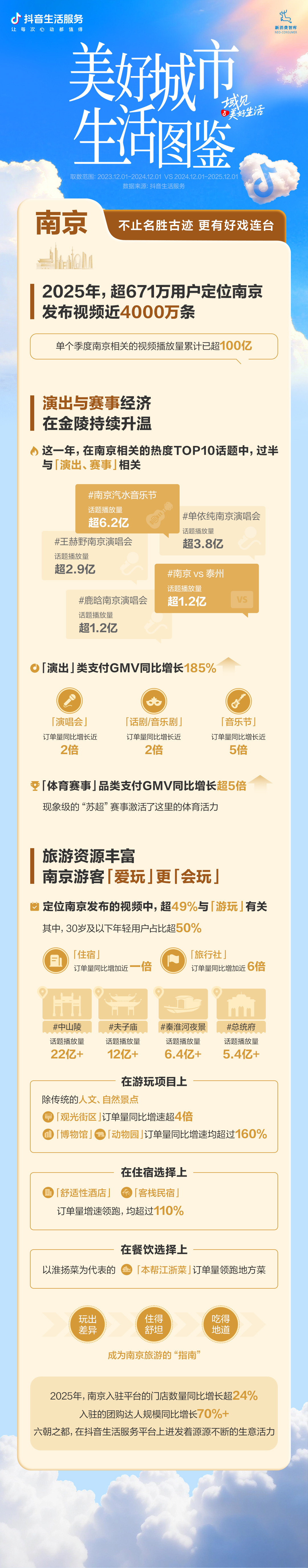 1月14日,抖音生活服务发布《美好城市生活图鉴》。数据显示,南京依托其丰厚的文化底蕴与大型活动势能,以“演出与赛事经济”为特色,在平台上汇聚消费人气,成为“文化驱动型”增长的代表城市之一。
